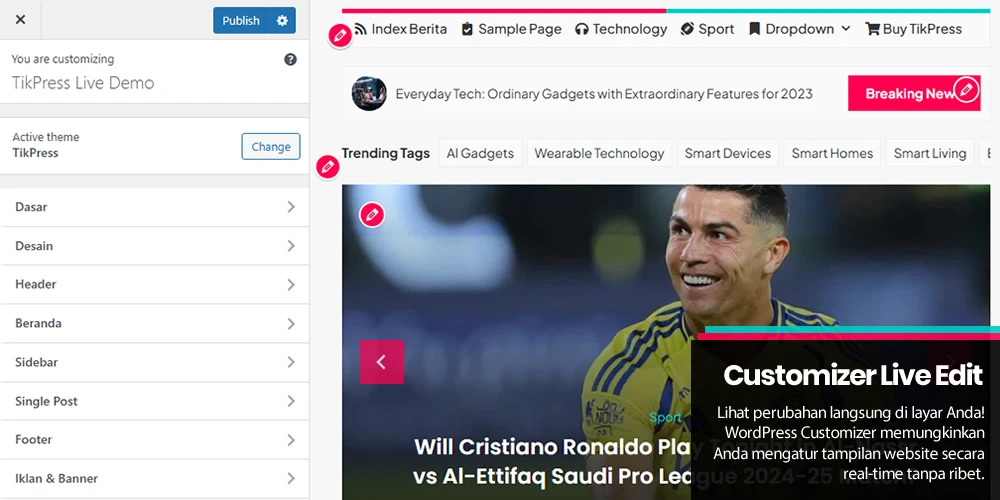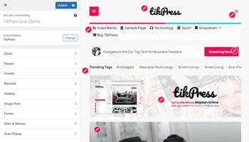 Tanpa perlu keahlian teknis, Anda bisa mengatur tampilan website sesuai kebutuhan melalui panel pengaturan tema dan Customizer bawaan WordPress. Ganti logo, ubah warna, pilih jenis huruf, atau sesuaikan layout hanya dengan beberapa klik. TikPress dirancang agar siapa pun bisa membuat website berita profesional dengan cepat dan efisien.