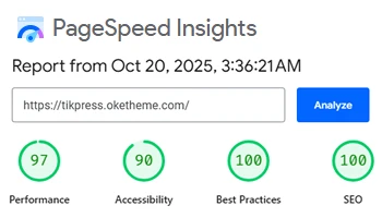 Struktur tema TikPress dibangun dengan praktik terbaik SEO. Mulai dari penggunaan heading yang teratur, kecepatan loading yang tinggi, hingga dukungan breadcrumb dan schema markup. Semua ini membantu website Anda tampil lebih baik di hasil pencarian Google dan menjangkau audiens yang lebih luas.