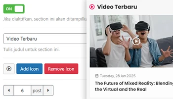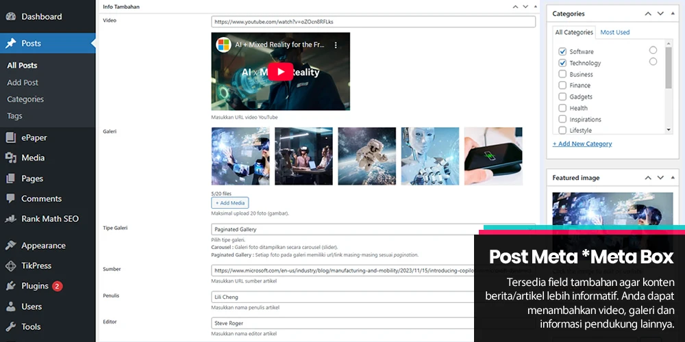 Dukung konten video dengan tampilan yang optimal. Fitur ini memudahkan Anda menyematkan video langsung ke dalam artikel. Caranya mudah, cukup copy url video Youtube, paste pada kolom yang sudah disediakan pada meta post.