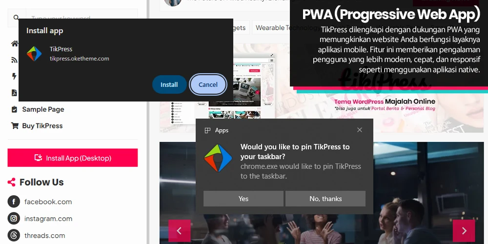 TikPress dilengkapi dengan dukungan PWA yang memungkinkan website Anda berfungsi layaknya aplikasi mobile. Fitur ini memberikan pengalaman pengguna yang lebih modern, cepat, dan responsif seperti menggunakan aplikasi native.