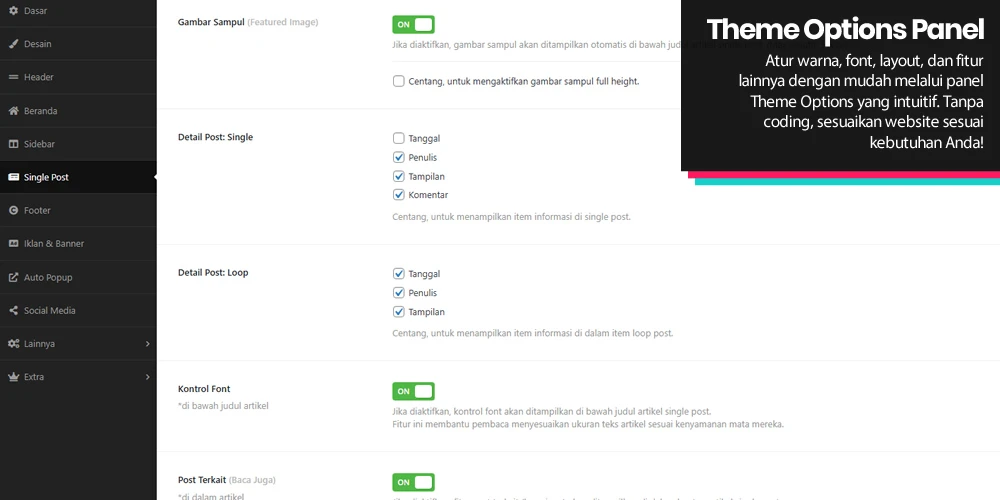 Sesuaikan tema dengan mudah menggunakan panel pengaturan yang intuitif, memungkinkan Anda mengubah tampilan dan fungsionalitas tanpa perlu pengetahuan ngoding sama sekali. Newby friendly!