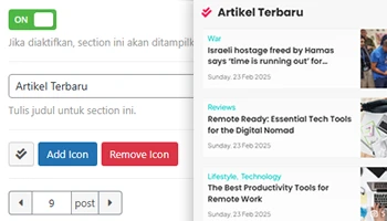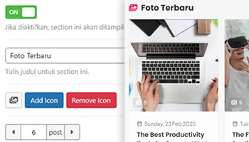 Tampilkan artikel terbaru yang rapi. Pengunjung dapat dengan mudah menemukan konten terkini karena ditampilkan dengan rapi dan teratur. Mode tampilan juga dapat disesuaikan, diantaranya: grid, list, dan carousel.