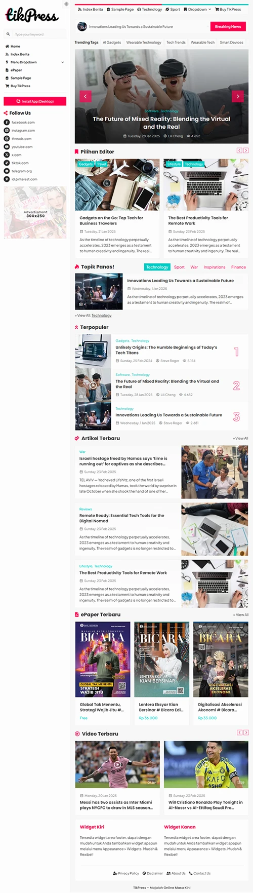 TikPress diciptakan khusus untuk Anda yang ingin membangun website berita, majalah online, atau blog profesional dengan tampilan kekinian. Layoutnya yang terinspirasi dari gaya media sosial populer TikTok menghadirkan pengalaman membaca yang menarik, dinamis, dan tetap mudah diakses di berbagai perangkat.