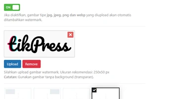 Tambahkan watermark otomatis pada gambar (png, jpg, webp) yang diunggah. Fitur ini melindungi hak cipta visual Anda dengan mudah tanpa memerlukan plugin tambahan.